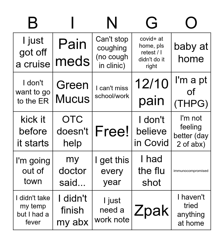 This bingo card has a free space and 32 words: Zpak, Abx inj, OTC doesn't help, Codeine Cough Syrup, I'm going out of town, Green Mucus, baby at home, immunocompromised, Pain meds, that's a fever for me, I can't miss school/work, Can't stop coughing (no cough in clinic), last time I was hospitalized, I've had all my covid shots, I don't believe in Covid, it's in my chest, I didn't take my temp but I had a fever, kick it before it starts, I get this every year, my doctor said..., I had the flu shot, what usually works for me, I'm not feeling better (day 2 of abx), I didn't finish my abx, I haven't tried anything at home, covid+ at home, pls retest / I didn't do it right, 12/10 pain, I don't want to go to the ER, I just got off a cruise, I just need a work note, can you send meds for my ... and I'm a pt of (THPG).
