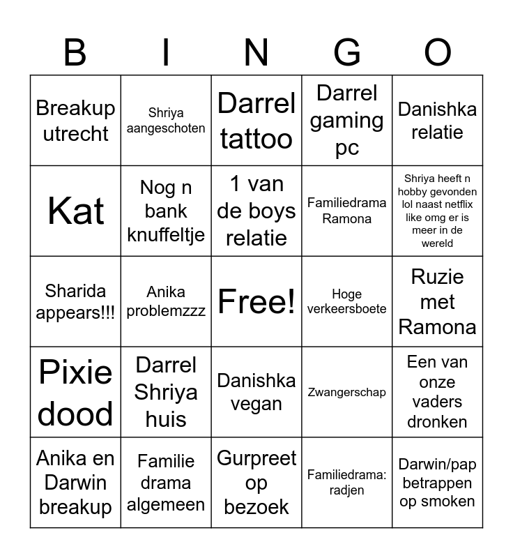 This bingo card has a free space and 24 words: Anika en Darwin breakup, Darrel Shriya huis, 1 van de boys relatie, Familiedrama: radjen, Danishka relatie, Breakup utrecht, Shriya aangeschoten, Darrel tattoo, Hoge verkeersboete, Ruzie met Ramona, Sharida appears!!!, Nog n bank knuffeltje, Zwangerschap, Een van onze vaders dronken, Kat, Familie drama algemeen, Gurpreet op bezoek, Darrel gaming pc, Shriya heeft n hobby gevonden lol naast netflix like omg er is meer in de wereld, Pixie dood, Anika problemzzz, Danishka vegan, Familiedrama Ramona and Darwin/pap betrappen op smoken.
