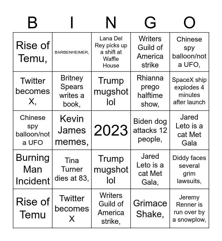 This bingo card has a free space and 52 words: SpaceX ship explodes 4 minutes after launch,, Jeremy Renner is run over by a snowplow,, Everything Everywhere All At Once wins a bunch of Oscars,, Writers Guild of America strike,, Tina Turner dies at 83,, OceanGate (RIP),, BARBENHEIMER,, Lana Del Rey picks up a shift at Waffle House,, Twitter becomes X,, Vegas Sphere opens,, Britney Spears writes a book,, Matthew Perry dies at 54,, Diddy faces several grim lawsuits,, Jared Leto is a cat Met Gala,, Burning Man Incident,, Andre 3000 flute album,, Trump mugshot lol, Biden dog attacks 12 people,, Girl Dinner,, Chinese spy balloon/not a UFO,, Kevin James memes,, Grimace Shake,, Rise of Temu,, Rhianna prego halftime show,, Snoop Dogg quits smoking for an ad, Peter Griffin comes to Fortnite, Starbucks boycott, Mexican alien autopsy, SpaceX ship explodes 4 minutes after launch, Jeremy Renner is run over by a snowplow, Everything Everywhere All At Once wins a bunch of Oscars, Writers Guild of America strike, Tina Turner dies at 83, OceanGate (RIP), BARBENHEIMER, Lana Del Rey picks up a shift at Waffle House, Twitter becomes X, Vegas Sphere opens, Britney Spears writes a book, Matthew Perry dies at 54, Diddy faces several grim lawsuits, Jared Leto is a cat Met Gala, Burning Man Incident, Andre 3000 flute album, Trump mugshot lol, Biden dog attacks 12 people, Girl Dinner, Chinese spy balloon/not a UFO, Kevin James memes, Grimace Shake, Rise of Temu and Rhianna prego halftime show.