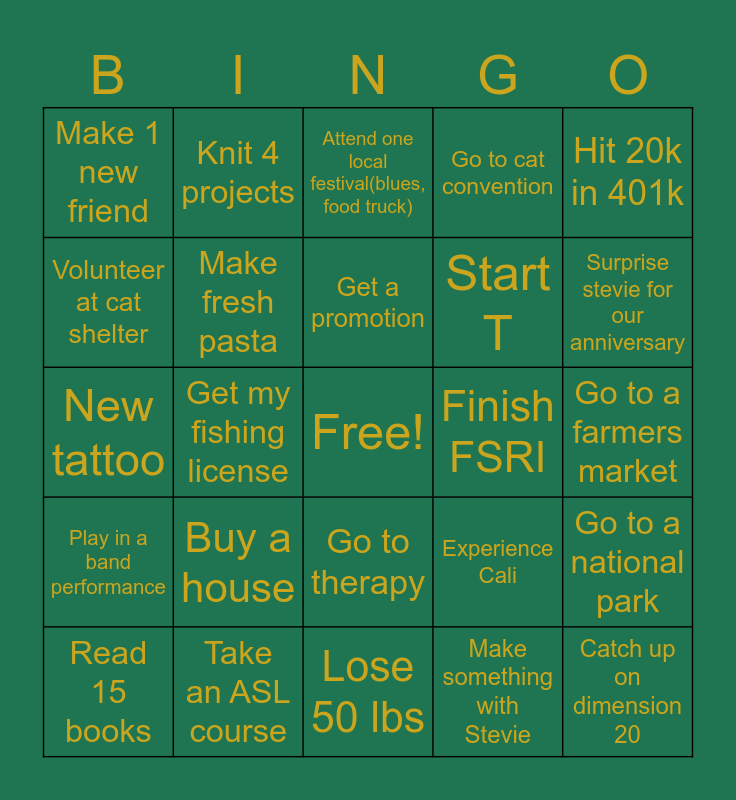 This bingo card has a free space and 25 words: Buy a house, Lose 50 lbs, Get a promotion, Read 15 books, Hit 20k in 401k, Make 1 new friend, Volunteer at cat shelter, Knit 4 projects, Finish FSRI, Go to therapy, Start T, New tattoo, Experience Cali, Go to a national park, Make fresh pasta, Get AJR merch at their concert, Go to a farmers market, Attend one local festival(blues, food truck), Surprise stevie for our anniversary, Get my fishing license, Catch up on dimension 20, Take an ASL course, Play in a band performance, Go to cat convention and Make something with Stevie.