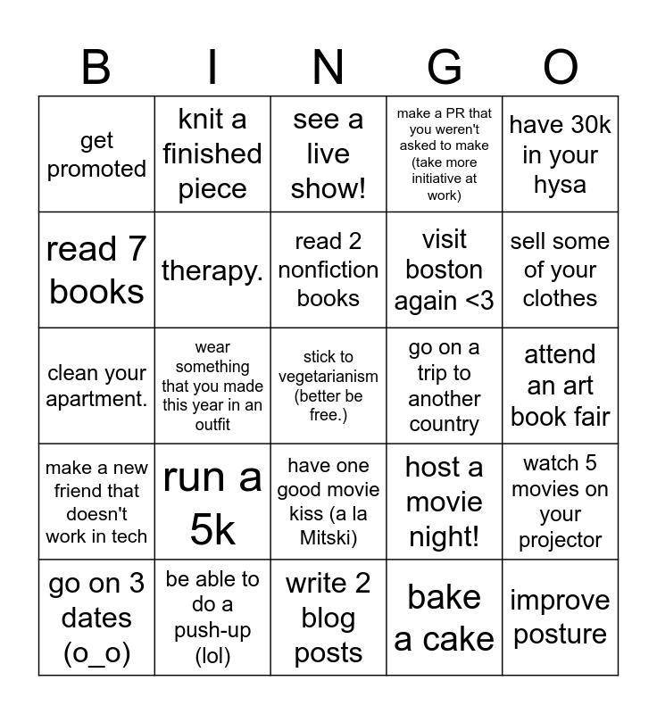 This bingo card has a free space and 24 words: run a 5k, be able to do a push-up (lol), read 2 nonfiction books, go on 3 dates (o_o), have 30k in your hysa, get promoted, read 7 books, knit a finished piece, go on a trip to another country, have one good movie kiss (a la Mitski), visit boston again <3, clean your apartment., host a movie night!, watch 5 movies on your projector, therapy., bake a cake, attend an art book fair, see a live show!, sell some of your clothes, wear something that you made this year in an outfit, improve posture, make a new friend that doesn't work in tech, make a PR that you weren't asked to make (take more initiative at work) and write 2 blog posts.