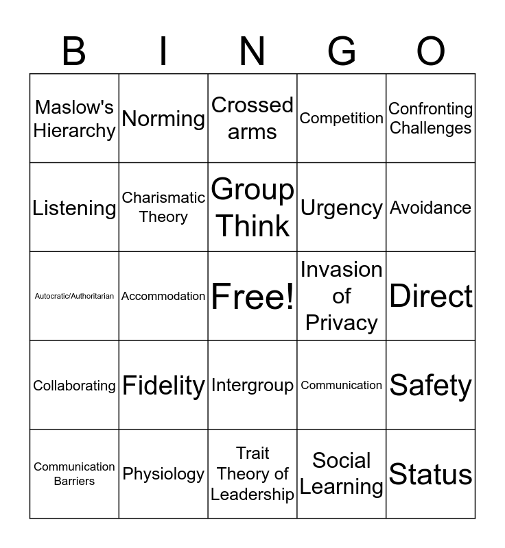 This bingo card has a free space and 24 words: Fidelity, Physiology, Group Think, Communication Barriers, Confronting Challenges, Maslow's Hierarchy, Listening, Norming, Invasion of Privacy, Intergroup, Urgency, Autocratic/Authoritarian, Communication, Safety, Charismatic Theory, Social Learning, Direct, Crossed arms, Avoidance, Accommodation, Status, Collaborating, Competition and Trait Theory of Leadership.