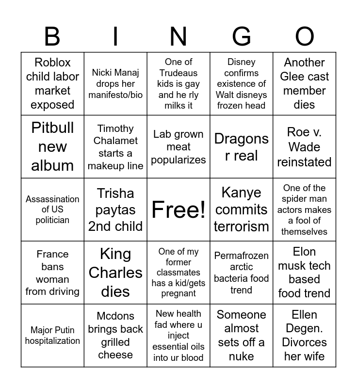 This bingo card has a free space and 24 words: King Charles dies, Mcdons brings back grilled cheese, Lab grown meat popularizes, Major Putin hospitalization, Another Glee cast member dies, Roblox child labor market exposed, Pitbull new album, Nicki Manaj drops her manifesto/bio, Kanye commits terrorism, One of my former classmates has a kid/gets pregnant, Dragons r real, Assassination of US politician, Permafrozen arctic bacteria food trend, Elon musk tech based food trend, Timothy Chalamet starts a makeup line, Someone almost sets off a nuke, One of the spider man actors makes a fool of themselves, One of Trudeaus kids is gay and he rly milks it, Roe v. Wade reinstated, Trisha paytas 2nd child, Ellen Degen. Divorces her wife, France bans woman from driving, Disney confirms existence of Walt disneys frozen head and New health fad where u inject essential oils into ur blood.