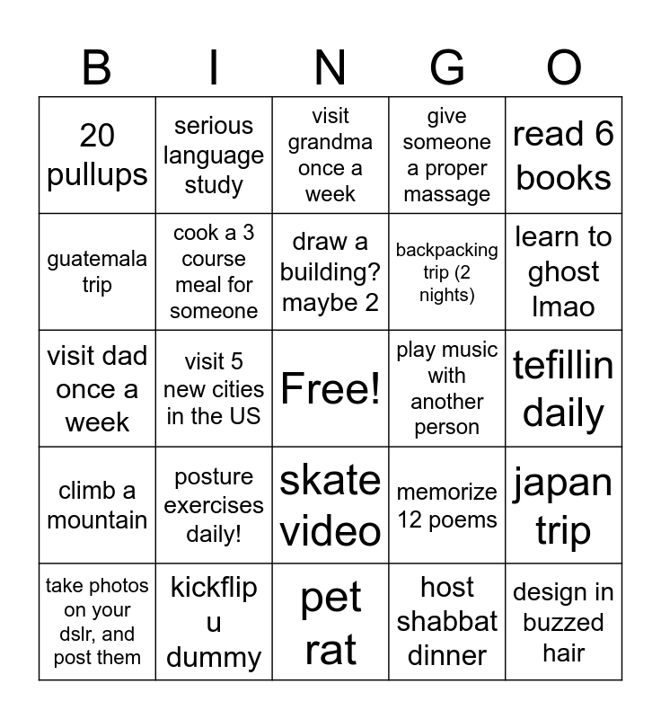 This bingo card has a free space and 24 words: posture exercises daily!, kickflip u dummy, draw a building? maybe 2, take photos on your dslr, and post them, read 6 books, 20 pullups, guatemala trip, serious language study, play music with another person, skate video, backpacking trip (2 nights), visit dad once a week, memorize 12 poems, japan trip, cook a 3 course meal for someone, host shabbat dinner, tefillin daily, visit grandma once a week, learn to ghost lmao, visit 5 new cities in the US, design in buzzed hair, climb a mountain, give someone a proper massage and pet rat.