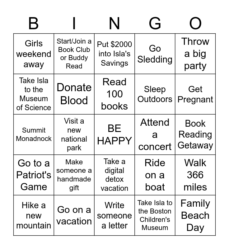 This bingo card has a free space and 24 words: Make someone a handmade gift, Go on a vacation, Read 100 books, Hike a new mountain, Throw a big party, Girls weekend away, Take Isla to the Museum of Science, Start/Join a Book Club or Buddy Read, Attend a concert, Take a digital detox vacation, Sleep Outdoors, Summit Monadnock, Ride on a boat, Walk 366 miles, Donate Blood, Take Isla to the Boston Children's Museum, Book Reading Getaway, Put $2000 into Isla's Savings, Get Pregnant, Visit a new national park, Family Beach Day, Go to a Patriot's Game, Go Sledding and Write someone a letter.