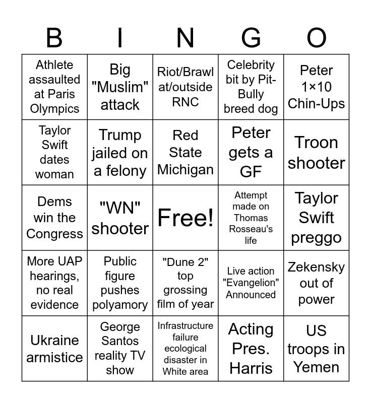 This bingo card has a free space and 24 words: Ukraine armistice, Public figure pushes polyamory, Red State Michigan, Acting Pres. Harris, Peter 1×10 Chin-Ups, Athlete assaulted at Paris Olympics, Big "Muslim" attack, Riot/Brawl at/outside RNC, Attempt made on Thomas Rosseau's life, Taylor Swift preggo, Dems win the Congress, Trump jailed on a felony, Live action "Evangelion" Announced, Zekensky out of power, Taylor Swift dates woman, George Santos reality TV show, Infrastructure failure ecological disaster in White area, Celebrity bit by Pit-Bully breed dog, Troon shooter, More UAP hearings, no real evidence, "WN" shooter, "Dune 2" top grossing film of year, Peter gets a GF and US troops in Yemen.