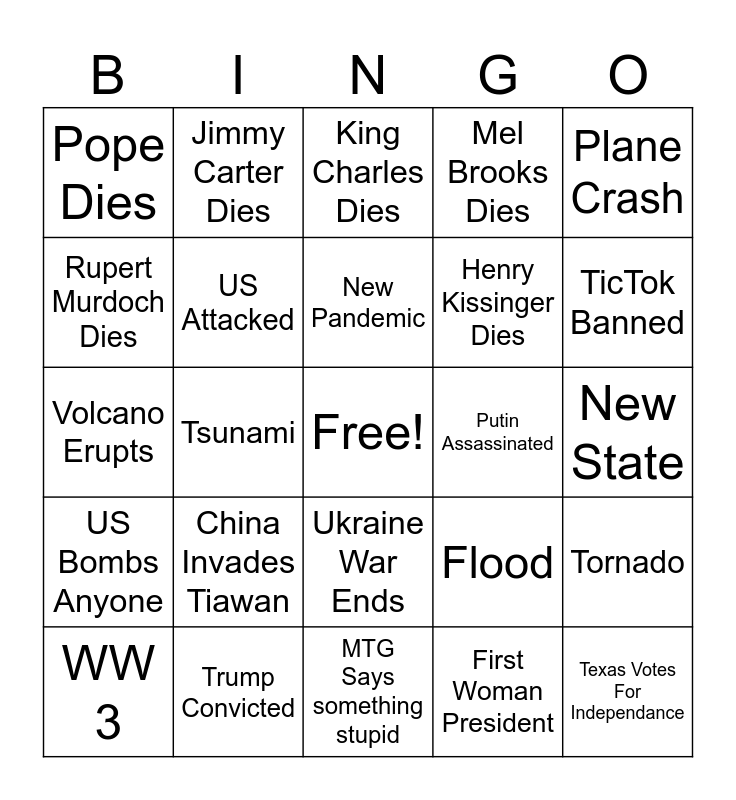 This bingo card has a free space and 29 words: WW 3, Earthquake, Tsunami, Yellowstone Erupts, Pope Dies, King Charles Dies, US Attacked, China Invades Tiawan, Putin Assassinated, Trump Convicted, New State, Texas Votes For Independance, MTG Says something stupid, First Woman President, TicTok Banned, Big Fire, Ukraine War Ends, US Bombs Anyone, Plane Crash, Volcano Erupts, Flood, A Government Falls, Henry Kissinger Dies, Rupert Murdoch Dies, Mel Brooks Dies, Jimmy Carter Dies, Tornado, New Pandemic and Country Closed Due to Snow.
