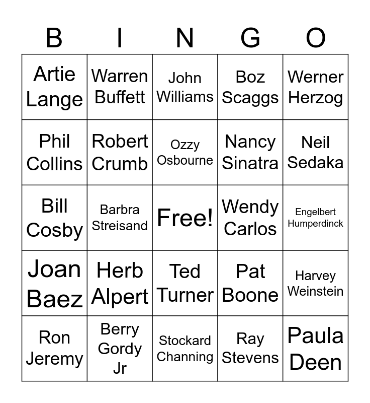 This bingo card has a free space and 24 words: Herb Alpert, Berry Gordy Jr, Ozzy Osbourne, Ron Jeremy, Werner Herzog, Artie Lange, Phil Collins, Warren Buffett, Wendy Carlos, Ted Turner, Nancy Sinatra, Bill Cosby, Pat Boone, Harvey Weinstein, Robert Crumb, Ray Stevens, Engelbert Humperdinck, John Williams, Neil Sedaka, Barbra Streisand, Paula Deen, Joan Baez, Boz Scaggs and Stockard Channing.