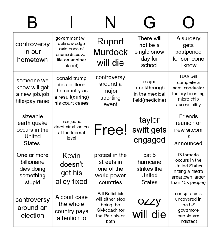 This bingo card has a free space and 24 words: Kevin doesn't get his alley fixed, A court case the whole country pays attention to, controversy around a major sporting event, controversy around an election, A surgery gets postponed for someone I know, controversy in our hometown, someone we know will get a new job/job title/pay raise, government will acknowledge existence of aliens(discover life on another planet), taylor swift gets engaged, protest in the streets in one of the world power countries, major breakthrough in the medical field(medicine), sizeable earth quake occurs in the United States., cat 5 hurricane strikes the United States, f5 tornado occurs in the United States hitting a metro area(town larger than 15k people), donald trump dies or flees the country as a result(during) his court cases, ozzy will die, Friends reunion or new sitcom is announced, Ruport Murdock will die, USA will complete a semi conductor factory boosting micro chip accessibility, marijuana decriminalization at the federal level, conspiracy is uncovered in the US govt(more people are indicted), One or more billionaire dies doing something stupid, There will not be a single snow day for school and Bill Belichick will either stop being the GM/coach for the Patriots or both.