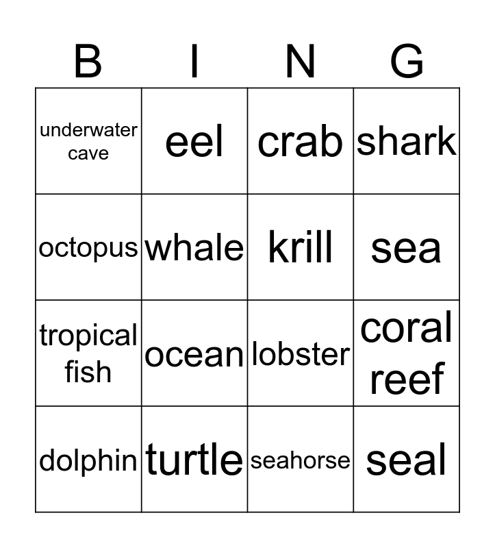 This bingo card has 16 words: turtle, coral reef, crab, underwater cave, tropical fish, eel, lobster, seahorse, octopus, whale, dolphin, shark, ocean, sea, krill and seal.