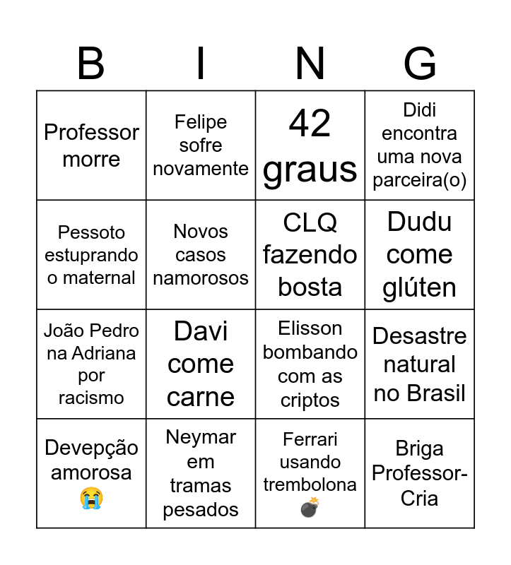 This bingo card has 16 words: Neymar em tramas pesados, Desastre natural no Brasil, 42 graus, Professor morre, JoĆ£o Pedro na Adriana por racismo, Felipe sofre novamente, Elisson bombando com as criptos, Ferrari usando trembolonaš£, Pessoto estuprando o maternal, Novos casos namorosos, Devepção amorosaš, Didi encontra uma nova parceira(o), Davi come carne, Dudu come glĆŗten, CLQ fazendo bosta and Briga Professor-Cria.