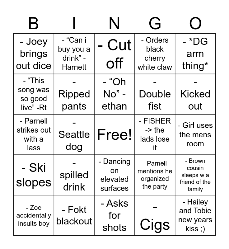 This bingo card has a free space and 24 words: - spilled drink, - Fokt blackout, - “Oh No” -ethan, - Zoe accidentally insults boy, - *DG arm thing*, - Joey brings out dice, - “This song was so good live” -Rt, - “Can i buy you a drink” -Harnett, - FISHER -> the lads lose it, - Dancing on elevated surfaces, - Double fist, - Parnell strikes out with a lass, - Parnell mentions he organized the party, - Brown cousin sleeps w a friend of the family, - Ripped pants, - Cigs, - Girl uses the mens room, - Cut off, - Kicked out, - Seattle dog, - Hailey and Tobie new years kiss ;), - Ski slopes, - Orders black cherry white claw and - Asks for shots.