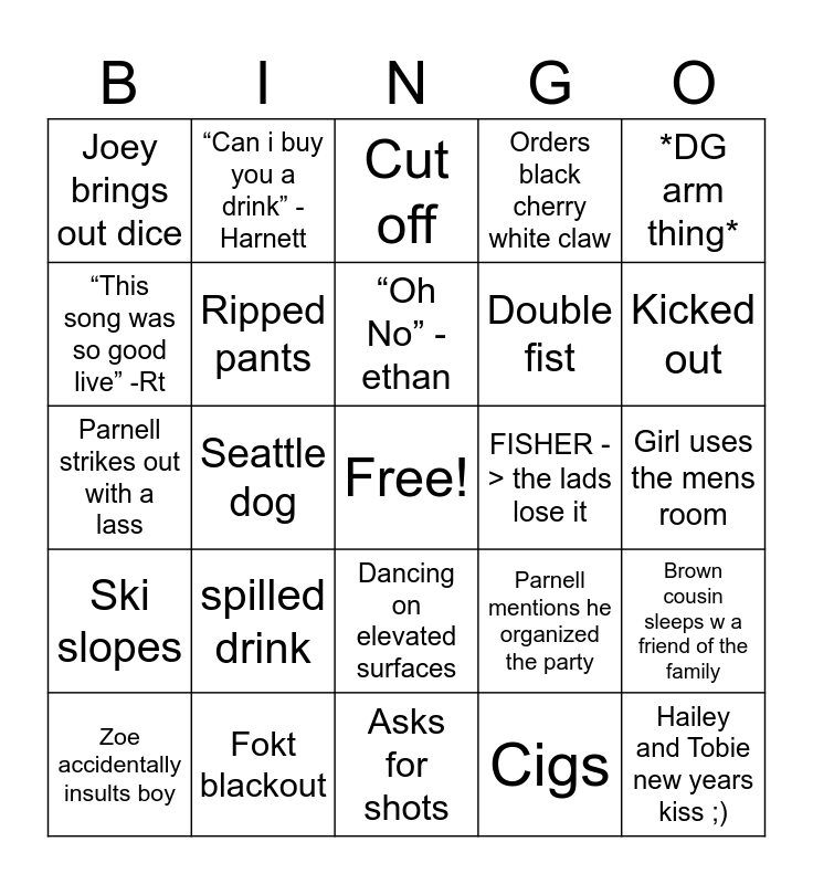 This bingo card has a free space and 24 words: spilled drink, Fokt blackout, “Oh No” -ethan, Zoe accidentally insults boy, *DG arm thing*, Joey brings out dice, “This song was so good live” -Rt, “Can i buy you a drink” -Harnett, FISHER -> the lads lose it, Dancing on elevated surfaces, Double fist, Parnell strikes out with a lass, Parnell mentions he organized the party, Brown cousin sleeps w a friend of the family, Ripped pants, Cigs, Girl uses the mens room, Cut off, Kicked out, Seattle dog, Hailey and Tobie new years kiss ;), Ski slopes, Orders black cherry white claw and Asks for shots.