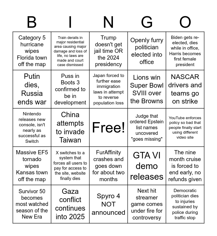 This bingo card has a free space and 24 words: X switches to a system that forces all users to pay for access to the site, website finally dies, Gaza conflict continues into 2025, Japan forced to further ease immigration laws in attempt to reverse population loss, Survivor 50 becomes most watched season of the New Era, Biden gets re-elected, dies while in office, Harris becomes first female president, Category 5 hurricane wipes Florida town off the map, Putin dies, Russia ends war, Train derails in major residential area causing major damage and loss of life, no laws are made and court case dismissed, Judge that ordered Epstein list names uncovered "goes missing", FurAffinity crashes and goes down for about two months, Lions win Super Bowl SVIII over the Browns, Nintendo releases new console, isn't nearly as successful as Switch, GTA VI demo releases, The nine month cruise is forced to end early, no refunds given, Puss in Boots 3 confirmed to be in development, Next hit streamer game comes under fire for controversy, YouTube enforces policy so bad that people finally start using different video site, Trump doesn't get jail time OR the 2024 presidency, NASCAR drivers and teams go on strike, China attempts to invade Taiwan, Democratic politician dies to injuries sustained by police during traffic stop, Massive EF5 tornado wipes Kansas town off the map, Openly furry politician elected into office and Spyro 4 NOT announced.
