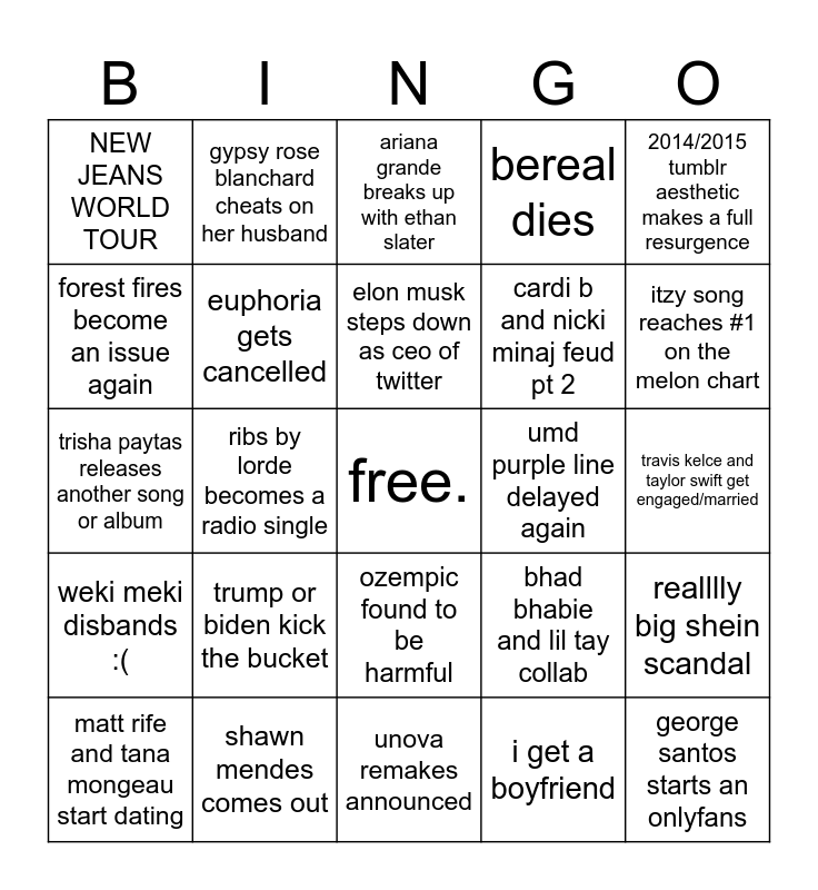 This bingo card has a free space and 24 words: trump or biden kick the bucket, shawn mendes comes out, elon musk steps down as ceo of twitter, matt rife and tana mongeau start dating, 2014/2015 tumblr aesthetic makes a full resurgence, NEW JEANS WORLD TOUR, forest fires become an issue again, gypsy rose blanchard cheats on her husband, umd purple line delayed again, ozempic found to be harmful, cardi b and nicki minaj feud pt 2, trisha paytas releases another song or album, bhad bhabie and lil tay collab, realllly big shein scandal, euphoria gets cancelled, i get a boyfriend, travis kelce and taylor swift get engaged/married, ariana grande breaks up with ethan slater, itzy song reaches #1 on the melon chart, ribs by lorde becomes a radio single, george santos starts an onlyfans, weki meki disbands :(, bereal dies and unova remakes announced.