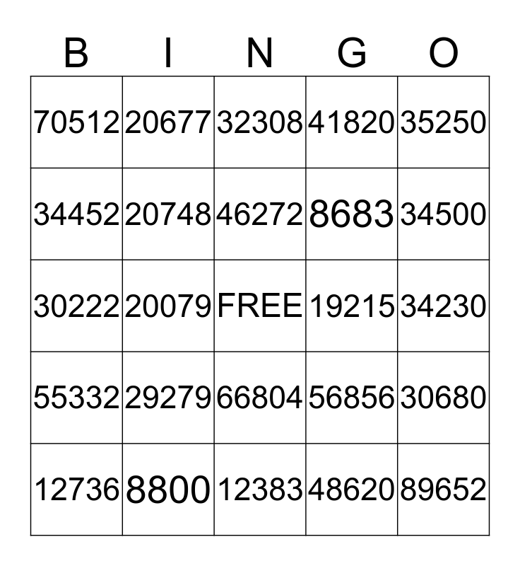 This bingo card has a free space and 24 words: 29279, 8800, 46272, 12736, 35250, 70512, 34452, 20677, 19215, 66804, 8683, 30222, 56856, 30680, 20748, 48620, 34230, 32308, 34500, 20079, 89652, 55332, 41820 and 12383.