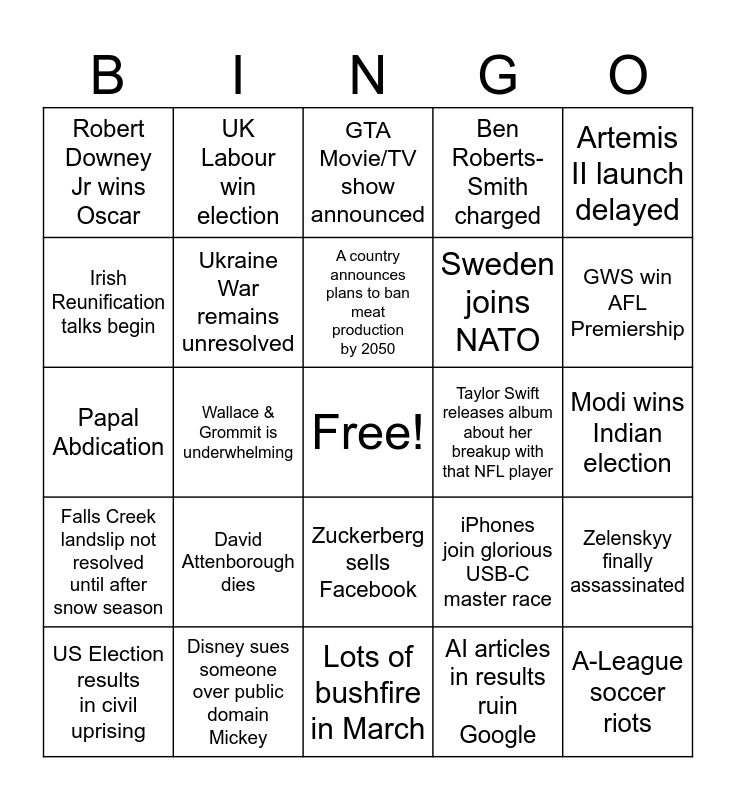 This bingo card has a free space and 24 words: David Attenborough dies, Disney sues someone over public domain Mickey, A country announces plans to ban meat production by 2050, US Election results in civil uprising, Artemis II launch delayed, Robert Downey Jr wins Oscar, Irish Reunification talks begin, UK Labour win election, Taylor Swift releases album about her breakup with that NFL player, Zuckerberg sells Facebook, Sweden joins NATO, Papal Abdication, iPhones join glorious USB-C master race, Zelenskyy finally assassinated, Ukraine War remains unresolved, AI articles in results ruin Google, Modi wins Indian election, GTA Movie/TV show announced, GWS win AFL Premiership, Wallace & Grommit is underwhelming, A-League soccer riots, Falls Creek landslip not resolved until after snow season, Ben Roberts-Smith charged and Lots of bushfire in March.