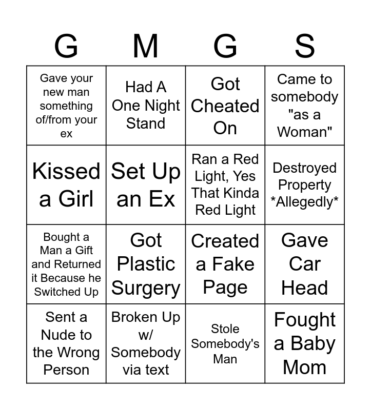 This bingo card has 16 words: Broken Up w/ Somebody via text, Gave Car Head, Got Cheated On, Gave your new man something of/from your ex, Bought a Man a Gift and Returned it Because he Switched Up, Had A One Night Stand, Created a Fake Page, Stole Somebody's Man, Kissed a Girl, Set Up an Ex, Sent a Nude to the Wrong Person, Came to somebody "as a Woman", Got Plastic Surgery, Destroyed Property *Allegedly*, Ran a Red Light, Yes That Kinda Red Light and Fought a Baby Mom.