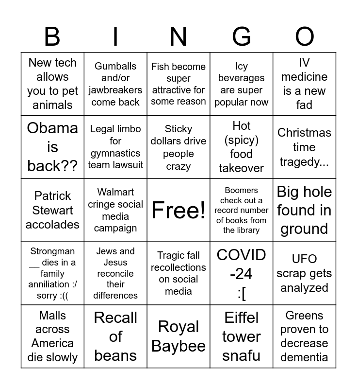 This bingo card has a free space and 24 words: Jews and Jesus reconcile their differences, Recall of beans, Sticky dollars drive people crazy, Malls across America die slowly, IV medicine is a new fad, New tech allows you to pet animals, Obama is back??, Gumballs and/or jawbreakers come back, Boomers check out a record number of books from the library, Tragic fall recollections on social media, Hot (spicy) food takeover, Patrick Stewart accolades, COVID -24 :[, UFO scrap gets analyzed, Legal limbo for gymnastics team lawsuit, Eiffel tower snafu, Big hole found in ground, Fish become super attractive for some reason, Christmas time tragedy..., Walmart cringe social media campaign, Greens proven to decrease dementia, Strongman __ dies in a family anniliation :/ sorry :((, Icy beverages are super popular now and Royal Baybee.