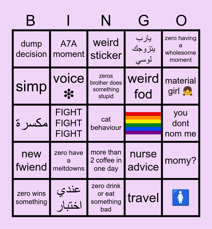 This bingo card has 1 images and 24 words: zero have a meltdowns, zero drink or eat something bad, zeros brother does something stupid, zero wins something, zero having a wholesome moment, dump decision, simp, A7A moment, more than 2 coffee in one day, weird fod, مكسرة, nurse advice, momy?, voice ❇, 🚺, you dont nom me, weird sticker, material girl 👧, FIGHT FIGHT FIGHT, cat behaviour, عندي اختبار, new fwiend, يارب يتزوجك لوسي and travel.
