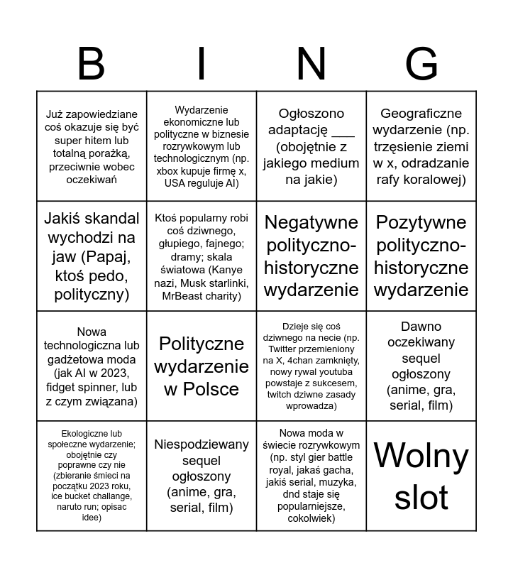 This bingo card has 16 words: Niespodziewany sequel ogłoszony (anime, gra, serial, film), Dawno oczekiwany sequel ogłoszony (anime, gra, serial, film), Ogłoszono adaptację ___ (obojętnie z jakiego medium na jakie), Już zapowiedziane coś okazuje się być super hitem lub totalną porażką, przeciwnie wobec oczekiwań, Nowa technologiczna lub gadżetowa moda (jak AI w 2023, fidget spinner, lub z czym związana), Wydarzenie ekonomiczne lub polityczne w biznesie rozrywkowym lub technologicznym (np. xbox kupuje firmę x, USA reguluje AI), Dzieje się coś dziwnego na necie (np. Twitter przemieniony na X, 4chan zamknięty, nowy rywal youtuba powstaje z sukcesem, twitch dziwne zasady wprowadza), Nowa moda w świecie rozrywkowym (np. styl gier battle royal, jakaś gacha, jakiś serial, muzyka, dnd staje się popularniejsze, cokolwiek), Jakiś skandal wychodzi na jaw (Papaj, ktoś pedo, polityczny), Ktoś popularny robi coś dziwnego, głupiego, fajnego; dramy; skala światowa (Kanye nazi, Musk starlinki, MrBeast charity), Ekologiczne lub społeczne wydarzenie; obojętnie czy poprawne czy nie (zbieranie śmieci na początku 2023 roku, ice bucket challange, naruto run; opisac idee), Geograficzne wydarzenie (np. trzęsienie ziemi w x, odradzanie rafy koralowej), Polityczne wydarzenie w Polsce, Pozytywne polityczno-historyczne wydarzenie, Negatywne polityczno-historyczne wydarzenie and Wolny slot.