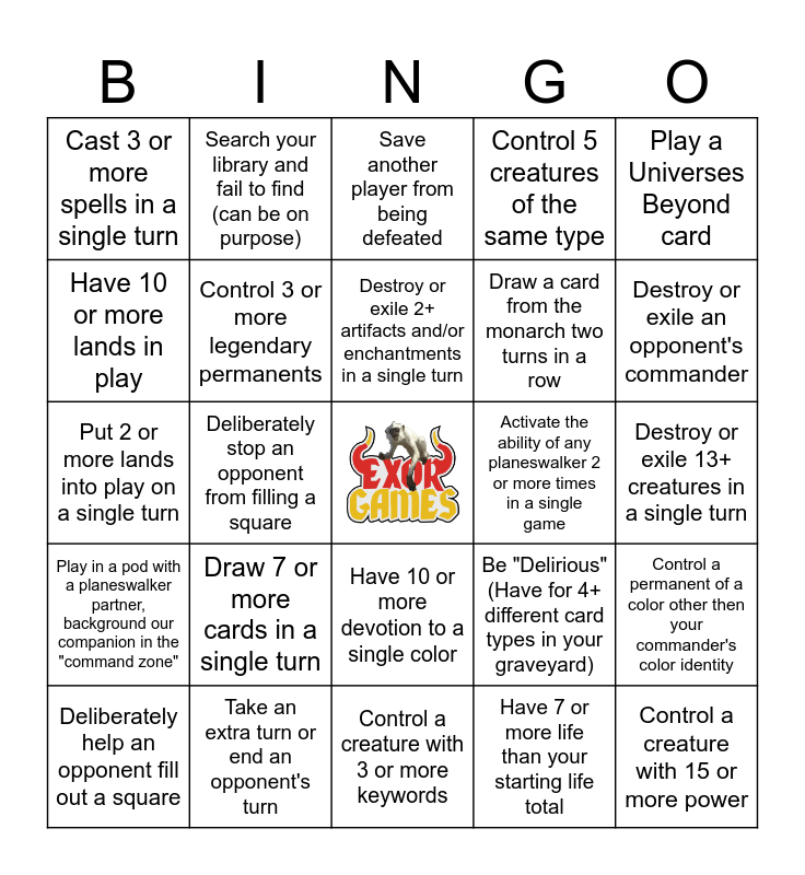 This bingo card has a free space and 44 words: Cast your commander 3 or more times in the same game, Control a creature with 15 or more power, Turn 1 ramp (rocks or birds), Deliberately help an opponent fill out a square, Control a card on it's backside or flipped, Have 7 or more life than your starting life total, Save another player from being defeated, Return a card from your graveyard to your hand, library or the battlefield, Play a Universes Beyond card, Take an extra turn or end an opponent's turn, Control 5 creatures of the same type, Activate the ability of any planeswalker 2 or more times in a single game, Have 10 or more devotion to a single color, Draw 7 or more cards in a single turn, Play a non-commander card from anywhere other then your hand, Control a creature with 3 or more keywords, Control 7 or more treasures, food, blood and/or clues, Put 2 or more lands into play on a single turn, Defeat an opponent with commander damage, Destroy or exile an opponent's commander, Search your library and fail to find (can be on purpose), Have 5 or more permanent types in play, Be defeated or defeat an opponent before turn 7, Cast 3 or more spells in a single turn, Have every color among the decks in your pod, Destroy or exile 13+ creatures in a single turn, Go infinite or prevent someone from going infinite, Finish a game without playing a commander, Be "Delirious" (Have for 4+ different card types in your graveyard), Play in a pod with a planeswalker partner, background our companion in the "command zone", Be "Hellbent" (Have no cards in your hand), Control a permanent of a color other then your commander's color identity, Draw first blood, Destroy or exile a planeswalker, Deliberately stop an opponent from filling a square, Attack all opponents on the same turn, Play with a deck that you do not own, Have more cards in your graveyard then in your library, Destroy or exile 2+ artifacts and/or enchantments in a single turn, Have 10 or more lands in play, Draw a card from the monarch two turns in a row, Cast a non-instant spell on an opponent's turn, Control 3 or more legendary permanents and Bolt the bird or naturalize the rock.