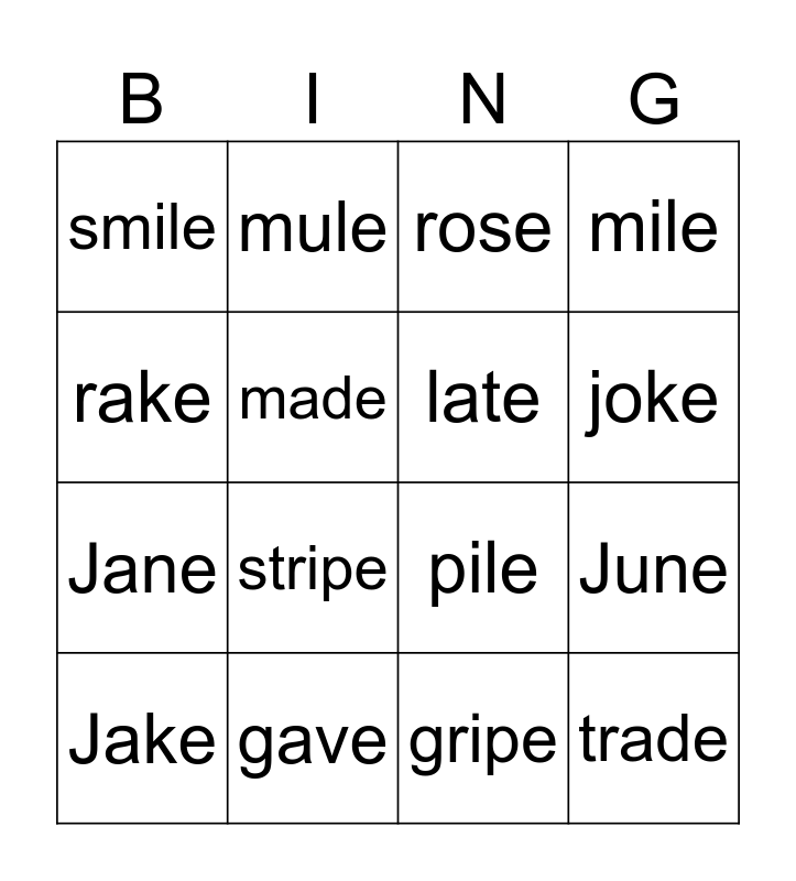 This bingo card has 30 words: Free!, Pete, June, blaze, smile, rose, late, tune, gave, home, gripe, Jake, robe, size, stripe, cute, dude, trade, drive, rake, pile, note, mule, Jane, made, mile, code, rode, joke and taped.