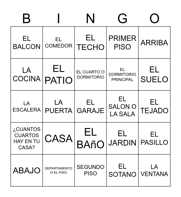 This bingo card has a free space and 24 words: CASA, DEPARTAMENTO O EL PISO, EL CUARTO O DORMITORIO, ABAJO, ARRIBA, EL BALCON, LA COCINA, EL COMEDOR, EL SALON O LA SALA, EL BAñO, EL DORMITORIO PRINCIPAL, LA ESCALERA, EL JARDIN, EL PASILLO, EL PATIO, EL SOTANO, EL TEJADO, EL TECHO, EL SUELO, LA PUERTA, LA VENTANA, ¿CUANTOS CUARTOS HAY EN TU CASA?, PRIMER PISO and SEGUNDO PISO.