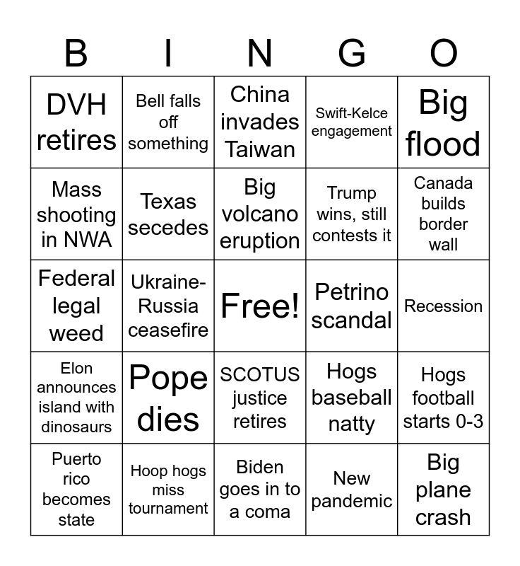 This bingo card has a free space and 24 words: Pope dies, Hoop hogs miss tournament, Big volcano eruption, Puerto rico becomes state, Big flood, DVH retires, Mass shooting in NWA, Bell falls off something, Petrino scandal, SCOTUS justice retires, Trump wins, still contests it, Federal legal weed, Hogs baseball natty, Hogs football starts 0-3, Texas secedes, New pandemic, Recession, China invades Taiwan, Canada builds border wall, Ukraine-Russia ceasefire, Big plane crash, Elon announces island with dinosaurs, Swift-Kelce engagement and Biden goes in to a coma.