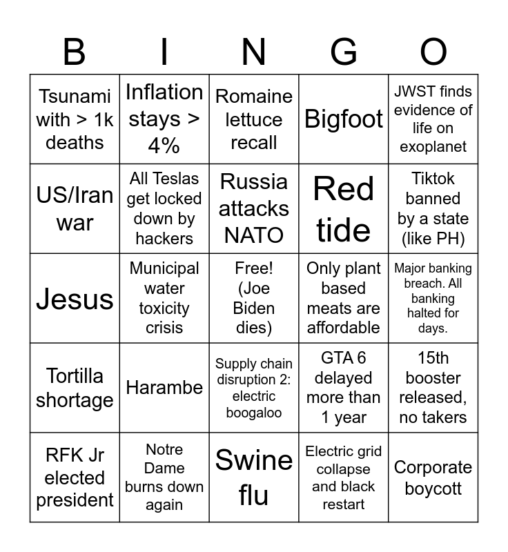 This bingo card has a free space and 24 words: Harambe, Notre Dame burns down again, Russia attacks NATO, RFK Jr elected president, JWST finds evidence of life on exoplanet, Tsunami with > 1k deaths, US/Iran war, Inflation stays > 4%, Only plant based meats are affordable, Supply chain disruption 2: electric boogaloo, Red tide, Jesus, GTA 6 delayed more than 1 year, 15th booster released, no takers, All Teslas get locked down by hackers, Electric grid collapse and black restart, Major banking breach. All banking halted for days., Romaine lettuce recall, Tiktok banned by a state (like PH), Municipal water toxicity crisis, Corporate boycott, Tortilla shortage, Bigfoot and Swine flu.