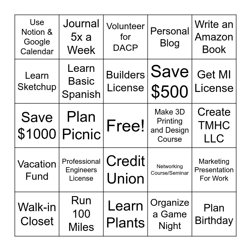 This bingo card has a free space and 24 words: Professional Engineers License, Run 100 Miles, Builders License, Walk-in Closet, Write an Amazon Book, Use Notion & Google Calendar, Learn Sketchup, Journal 5x a Week, Make 3D Printing and Design Course, Credit Union, Save $500, Save $1000, Networking Course/Seminar, Marketing Presentation For Work, Learn Basic Spanish, Organize a Game Night, Create TMHC LLC, Volunteer for DACP, Get MI License, Plan Picnic, Plan Birthday, Vacation Fund, Personal Blog and Learn Plants.