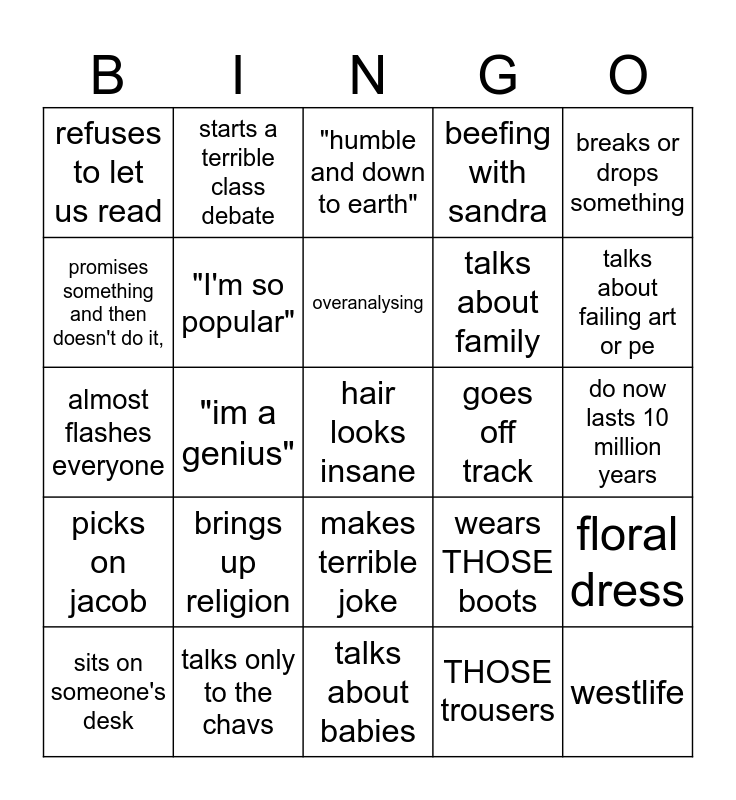 This bingo card has a free space and 25 words: brings up religion, talks about babies, overanalysing, sits on someone's desk, breaks or drops something, refuses to let us read, promises something and then doesn't do it,, starts a terrible class debate, goes off track, makes terrible joke, talks about family, almost flashes everyone, wears THOSE boots, floral dress, "I'm so popular", gets electrocuted, do now lasts 10 million years, "humble and down to earth", talks about failing art or pe, "im a genius", westlife, talks only to the chavs, picks on jacob, beefing with sandra and THOSE trousers.