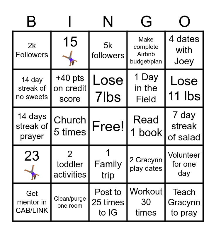 This bingo card has a free space and 24 words: 2 toddler activities, Clean/purge one room, Lose 7lbs, Get mentor in CAB/LINK, 4 dates with Joey, 2k Followers, 14 day streak of no sweets, 15 🤸🏾♀️, Read 1 book, 1 Family trip, 1 Day in the Field, 14 days streak of prayer, 2 Gracynn play dates, Volunteer for one day, +40 pts on credit score, Workout 30 times, 7 day streak of salad, 5k followers, Lose 11 lbs, Church 5 times, Teach Gracynn to pray, 23 🤸🏾♀️, Make complete Airbnb budget/plan and Post to 25 times to IG.