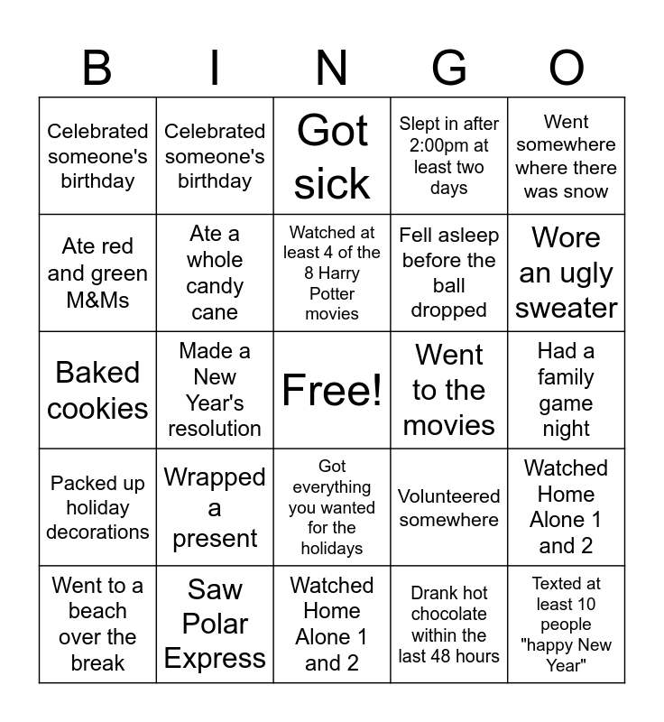 This bingo card has a free space and 35 words: Has a birthday in January, Wrapped a present, Doesn't like Winter, Ate a whole candy cane, Got everything you wanted for the holidays, Slept in after 2:00pm at least two days, Ate red and green M&Ms, Are tired of Christmas songs, Watched at least 4 of the 8 Harry Potter movies, Stayed up to watch the ball drop, Baked cookies, Went somewhere where there was snow, Went somewhere where you needed a passport, Saw at least 5 relatives you haven't seen in over 6 months, Celebrated someone's birthday, Went to the movies, Drank hot chocolate within the last 48 hours, Made a New Year's resolution, Packed up holiday decorations, Texted at least 10 people "happy New Year", Volunteered somewhere, Went to a beach over the break, Watched Home Alone 1 and 2, Saw Polar Express, Got sick, Wore an ugly sweater, Saw a Star Wars movie, Went somewhere to look at lights, Fell asleep before the ball dropped, Had a family game night, Read a book, Watched Home Alone 1 and 2, Wrapped a present, Celebrated someone's birthday and Is wearing blue and white today.