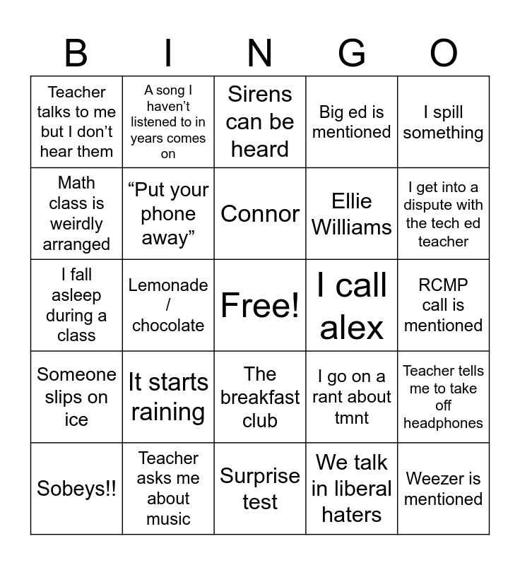 This bingo card has a free space and 34 words: David is mentioned, Substitute teacher, Deadnamed, Running into someone, RCMP call is mentioned, Math class is weirdly arranged, “Put your phone away”, Surprise test, Ellie Williams, Weezer is mentioned, I fall asleep during a class, A song I haven’t listened to in years comes on, We talk in liberal haters, I’m too scared to say here in tech ed, Someone slips on ice, Lemonade / chocolate, The breakfast club, I call alex, Teacher tells me to take off headphones, Sobeys!!, Teacher asks me about music, I spend 10+ minutes looking for Xander, Big ed is mentioned, I get into a dispute with the tech ed teacher, Radiohead comes on, It starts raining, Sirens can be heard, Kicked out of sobeys, I spill something, Teacher talks to me but I don’t hear them, Spiderman is mentioned, Connor, I go on a rant about tmnt and I talk about these bingo cards.