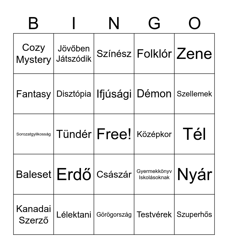 This bingo card has a free space and 151 words: 1001 könyv listán szerepel, 19. század, Afrika, Akció, Alakváltó, Amerikai Szerző, Angol Szerző, Boszorkány, Barátság, Chick lit, Család, Dark Fantasy, Démon, Detektívtörténet, Disztópia, Fantasy, Felnőtt Tartalom, Férfi Főszereplő, Filmadaptáció, Házasság, Horror, Humoros, Időutazás, Illusztrált, Japán Szerző, Kalandregény, Klasszikus, Középkor, Krimi, Kutya, Mitológia, Novella, Ókor, Paranormális, Rejtély, Romantikus, Sárkány, Sci-Fi, Szuperhős, Thriller, Váltott Szemszög, Vámpír, Zene, Alkímia, Álom, Amnézia, Árva, Átok, Baleset, Balett, Cirkusz, Cozy Mystery, Császár, Cyberpunk, Dél-Korea, Divat, Dzsinn, Édesség, Egyetem, Egyiptom, Emberi Sorsok, Epikus Fantasy, Erdő, Expedíció, Fekete Humor, Földönkívüliek, Folklór, Függőség, Gitár, Gólem, Görögország, Gyermekkönyv Iskolásoknak, Háború, Hajó, Halloween, Herceg, Hercegnő, Hit, Időhurok, Ifjúsági, Ikrek, Istenek, Gyász, Jóslás, Jövőben Játszódik, Kalóz, Kanadai Szerző, Karácsony, Kártyajáték, Kémregény, Képregény, Kína, Királynő, Könyvtár, Lélektani, Levelek, LMBTQ, Macska, Mágikus Realizmus, Második esély, Meseregény, Memoár, Műkorcsolya, Napló, Népmese-adaptáció, Okkultizmus, Olaszország, Ősz, Pszichés Betegség, Realizmus, Regényes Életrajz, Rémtörtének, Sellő, Skócia, Sorozat Része, Sorozatgyilkosság, Spanyolország, Steampunk, Sütés, Szellemek, Színész, Szóbeli Bántalmazás, Szörny, Tabu, Tanár, Tavasz, Tél, Nyár, Temető, Tenger, Testvérek, Tolvaj, Történelmi Krimi, Tragédia, Túlélés, Tündér, Újrakezdés, Uralkodó, Űropera, Vallás, Varázslat, Vérfarkas, Verseny, Viking, Viktoriánus, Vírus, Weird Fiction, Western, Wicca, Zaklatás and Zombi.