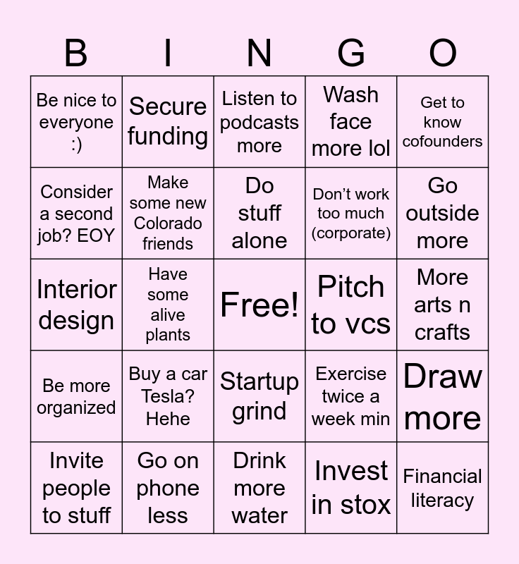 This bingo card has a free space and 24 words: Buy a car Tesla? Hehe, Go on phone less, Do stuff alone, Invite people to stuff, Get to know cofounders, Be nice to everyone :), Consider a second job? EOY, Secure funding, Pitch to vcs, Startup grind, Don’t work too much (corporate), Interior design, Exercise twice a week min, Draw more, Make some new Colorado friends, Invest in stox, More arts n crafts, Listen to podcasts more, Go outside more, Have some alive plants, Financial literacy, Be more organized, Wash face more lol and Drink more water.