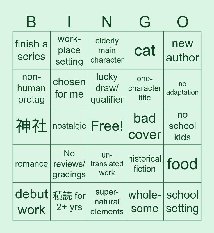 This bingo card has a free space and 24 words: No reviews/ gradings, 積読 for 2+ yrs, lucky draw/ qualifier, debut work, new author, finish a series, non-human protag, work-place setting, bad cover, un-translated work, one-character title, 神社, historical fiction, food, chosen for me, whole-some, no school kids, elderly main character, no adaptation, nostalgic, school setting, romance, cat and super-natural elements.