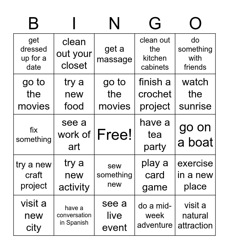 This bingo card has a free space and 29 words: visit a new city, visit a historical place, see a work of art, hike somewehre new, get dressed up for a date, get a massage, try a new food, try a new activity, have a tea party, have a conversation in Spanish, go on a boat, visit a natural attraction, see a live event, do a mid-week adventure, watch the sunrise, meditate 3x in a week, sew something new, try a new craft project, do something with friends, fix something, play a card game, do a puzzle, finish a crochet project, go to the movies, clean out the kitchen cabinets, clean out your closet, exercise in a new place, go to the movies and put away boxes.