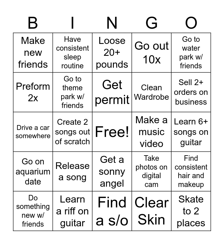 This bingo card has a free space and 24 words: Release a song, Learn a riff on guitar, Get permit, Do something new w/ friends, Go to water park w/ friends, Make new friends, Preform 2x, Have consistent sleep routine, Make a music video, Get a sonny angel, Clean Wardrobe, Drive a car somewhere, Take photos on digital cam, Find consistent hair and makeup, Go to theme park w/ friends, Clear Skin, Learn 6+ songs on guitar, Loose 20+ pounds, Sell 2+ orders on business, Create 2 songs out of scratch, Skate to 2 places, Go on aquarium date, Go out 10x and Find a s/o.
