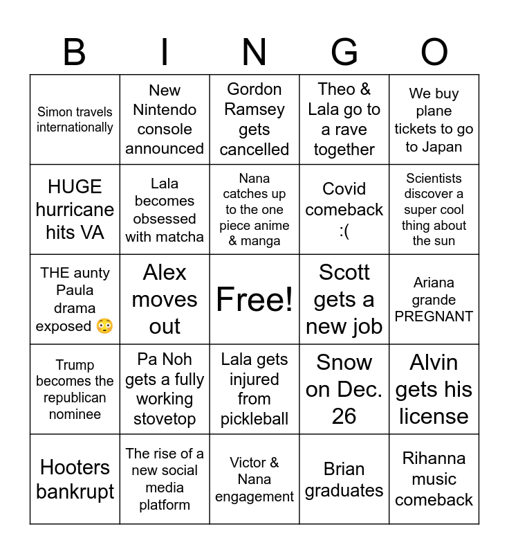 This bingo card has a free space and 24 words: Pa Noh gets a fully working stovetop, The rise of a new social media platform, Nana catches up to the one piece anime & manga, Hooters bankrupt, We buy plane tickets to go to Japan, Simon travels internationally, HUGE hurricane hits VA, New Nintendo console announced, Scott gets a new job, Lala gets injured from pickleball, Covid comeback :(, THE aunty Paula drama exposed 😳, Snow on Dec. 26, Alvin gets his license, Lala becomes obsessed with matcha, Brian graduates, Ariana grande PREGNANT, Gordon Ramsey gets cancelled, Scientists discover a super cool thing about the sun, Alex moves out, Rihanna music comeback, Trump becomes the republican nominee, Theo & Lala go to a rave together and Victor & Nana engagement.