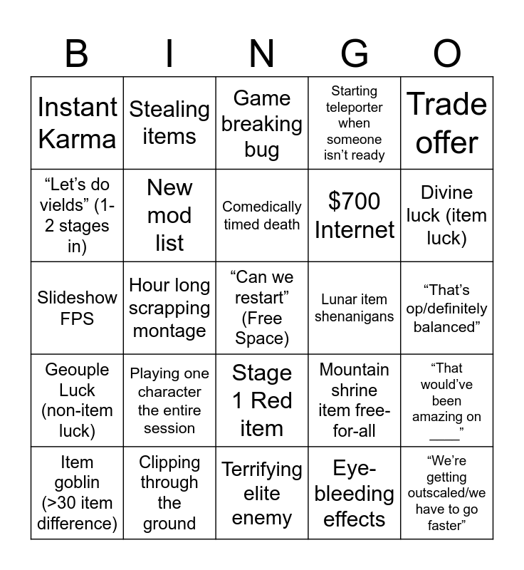 This bingo card has a free space and 24 words: Playing one character the entire session, Clipping through the ground, Comedically timed death, Item goblin (>30 item difference), Trade offer, Instant Karma, “Let’s do vields” (1-2 stages in), Stealing items, Lunar item shenanigans, Stage 1 Red item, $700 Internet, Slideshow FPS, Mountain shrine item free-for-all, “That would’ve been amazing on ____”, New mod list, Eye-bleeding effects, “That’s op/definitely balanced”, Game breaking bug, Divine luck (item luck), Hour long scrapping montage, “We’re getting outscaled/we have to go faster”, Geouple Luck (non-item luck), Starting teleporter when someone isn’t ready and Terrifying elite enemy.