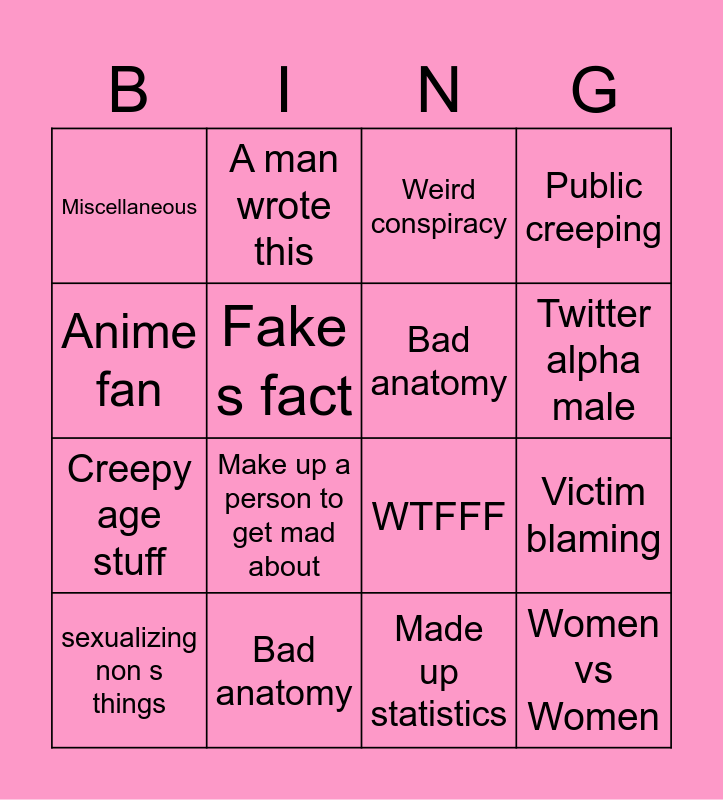 This bingo card has 16 words: Bad anatomy, Victim blaming, Weird conspiracy, Miscellaneous, Creepy age stuff, A man wrote this, WTFFF, Made up statistics, Anime fan, Fake s fact, sexualizing non s things, Public creeping, Make up a person to get mad about, Twitter alpha male, Bad anatomy and Women vs Women.