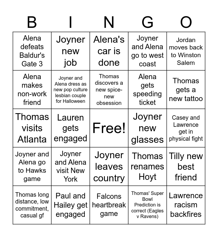 This bingo card has a free space and 24 words: Joyner and Alena visit New York, Paul and Hailey get engaged, Thomas discovers a new spice- new obsession, Thomas long distance, low commitment, casual gf, Jordan moves back to Winston Salem, Alena defeats Baldur's Gate 3, Alena makes non-work friend, Joyner new job, Joyner new glasses, Joyner leaves country, Alena gets speeding ticket, Thomas visits Atlanta, Thomas renames Hoyt, Tilly new best friend, Joyner and Alena dress as new pop culture lesbian couple for Halloween, Thomas' Super Bowl Prediction is correct (Eagles v Ravens), Casey and Lawrence get in physical fight, Alena's car is done, Thomas gets a new tattoo, Lauren gets engaged, Lawrence racism backfires, Joyner and Alena go to Hawks game, Joyner and Alena go to west coast and Falcons heartbreak game.