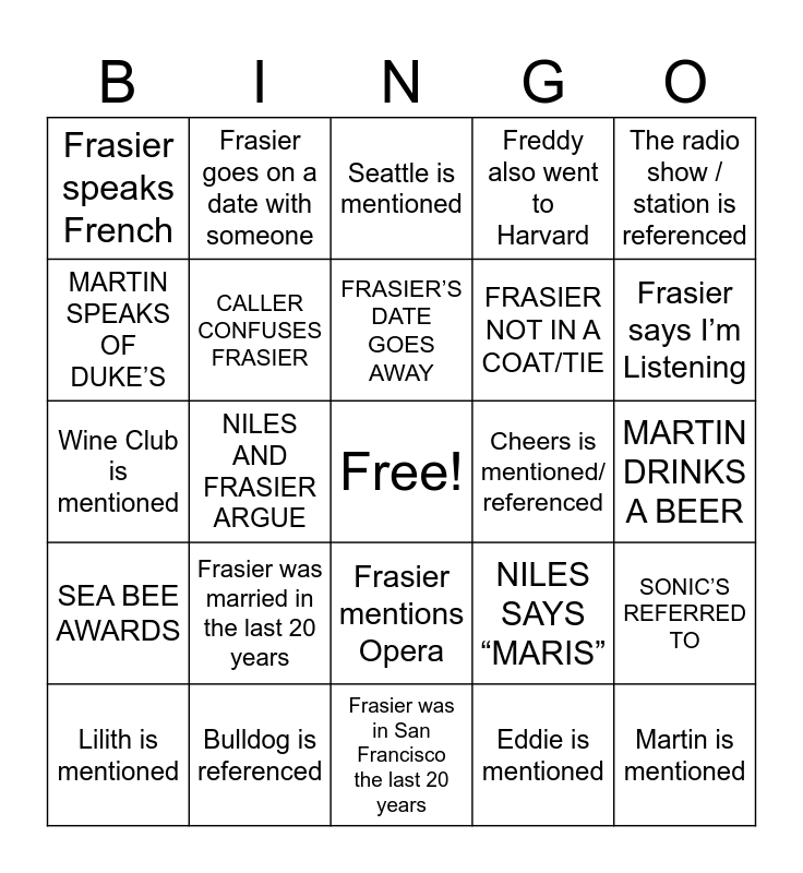 This bingo card has a free space and 43 words: Niles is mentioned, Martin is mentioned, Roz is mentioned, Lilith is mentioned, Daphne is mentioned, Eddie is mentioned, Seattle is mentioned, Sherry is mentioned, The radio show / station is referenced, Bulldog is referenced, Freddy also went to Harvard, Cheers is mentioned/ referenced, Frasier mentions Opera, Frasier was married in the last 20 years, Caffe nervosa is referenced, Frasier was in San Francisco the last 20 years, Frasier was on TV the last 20 years, Wine Club is mentioned, Martin’s Chair is mentioned, Frasier says I’m Listening, Frasier goes on a date with someone, Frasier sleeps with someone, Frasier says something dramatic “Good God” for example, Frasier speaks French, EDDIE STARES AT FRASIER, MARTIN DRINKS A BEER, “NILES, SHERRY?”, “CHEERS” FRIEND APPEARS, NILES SAYS “MARIS”, SEA BEE AWARDS, LILTH APPEARS, SONIC’S REFERRED TO, ROZ TELLS OFF FRASIER, NILES AND FRASIER ARGUE, FRASIER OR NILES PLAY PIANO, NILES LONGS FOR DAPHNE, FINE WINES ARE MENTIONED, FRASIER’S DATE GOES AWAY, MARTIN SPEAKS OF DUKE’S, FRASIER NOT IN A COAT/TIE, NILES DUSTS A CHAIR, CALLER CONFUSES FRASIER and DAPHNE IS OBLIVIOUS TO NILES.