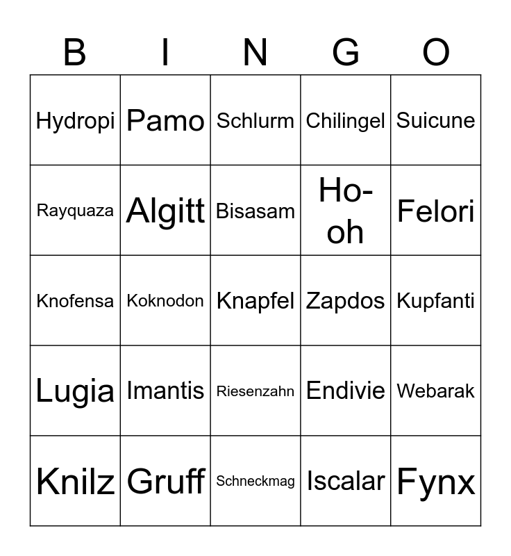 This bingo card has a free space and 24 words: Imantis, Gruff, Bisasam, Knilz, Suicune, Hydropi, Rayquaza, Pamo, Zapdos, Riesenzahn, Ho-oh, Knofensa, Endivie, Webarak, Algitt, Iscalar, Kupfanti, Schlurm, Felori, Koknodon, Fynx, Lugia, Chilingel and Schneckmag.