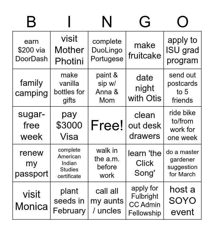 This bingo card has a free space and 24 words: complete American Indian Studies certificate, plant seeds in February, paint & sip w/ Anna & Mom, visit Monica, apply to ISU grad program, earn $200 via DoorDash, family camping, visit Mother Photini, clean out desk drawers, walk in the a.m. before work, date night with Otis, sugar-free week, learn 'the Click Song', do a master gardener suggestion for March, make vanilla bottles for gifts, apply for Fulbright CC Admin Fellowship, ride bike to/from work for one week, complete DuoLingo Portugese, send out postcards to 5 friends, pay $3000 Visa, host a SOYO event, renew my passport, make fruitcake and call all my aunts / uncles.