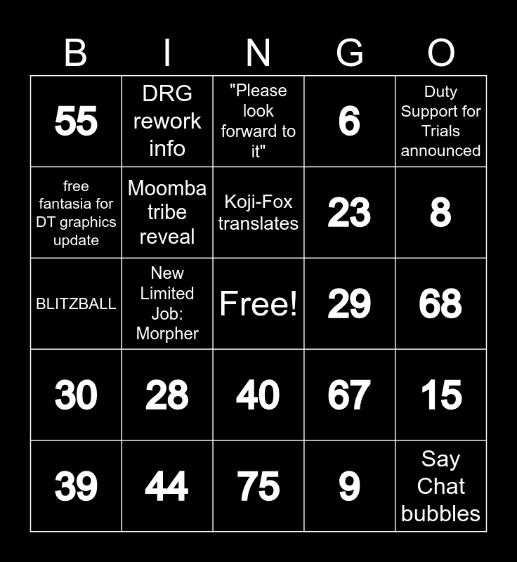 This bingo card has a free space and 75 words: Fem Hroths, Official Release Date, "Please look forward to it", Krile new job, Yoshi P Outfit Change, Deep Dungeon Info, Hats for buns/hroths copium, They talk about the plants 5+ times, New DPS: Painter/Artist and/or Green Mage, Next Mog tome event date, 6.55 date, |Allagans|, Koji-Fox translates, free fantasia for DT graphics update, AST rework info, New Limited Job: Morpher, New Dynamis server names, Say Chat bubbles, Lifestyle content info, Duty Support for Trials announced, Borderland Ruins Update, BLITZBALL, Moomba tribe reveal, DRG rework info, 6, 21, 35, 51, 66, 7, 22, 36, 52, 67, 8, 23, 37, 53, 68, 9, 24, 38, 54, 69, 10, 25, 39, 55, 70, 11, 26, 40, 56, 71, 12, 27, 41, 57, 72, 13, 28, 42, 58, 73, 14, 29, 43, 59, 74, 15, 30, 44, 60, 75 and 45.