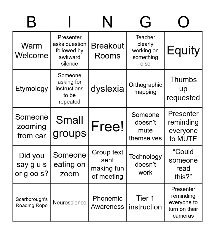 This bingo card has a free space and 29 words: Scarborough’s Reading Rope, Systematic phonics, Small groups, Decodable Readers, Warm Welcome, Breakout Rooms, Someone asking for instructions to be repeated, Someone eating on zoom, Someone doesn’t mute themselves, Neuroscience, Presenter reminding everyone to MUTE, Presenter reminding everyone to turn on their cameras, Phonemic Awareness, Tier 1 instruction, Thumbs up requested, Seasoned veteran snarky comment, Group text sent making fun of meeting, Did you say g u s or g oo s?, Equity, Someone zooming from car, Technology doesn’t work, Schwa, Orthographic mapping, Etymology, Teacher clearly working on something else, Presenter asks question followed by awkward silence, “Could someone read this?”, dyslexia and Four part processor.