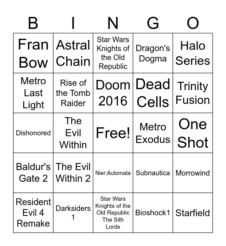 This bingo card has a free space and 125 words: Alice Madness, Assassins Creed Black Flag, Assassin's Creed Odyssey, Assassin's Creed Origins, Baldur's Gate 3, Baldur's Gate, Baldur's Gate 2, Bayonetta, Bioshock1, Bioshock 2, Bioshock Infinite, Borderlands 3, Code Vein, Crawl, Cuphead, Cyberpunk, Darksiders 1, Darksiders 2, Darksiders 3, Dead Space Remake, Disco Elysium, Dishonored, Dishonored 2, Divinity 1, Divinity 2, Doom 2016, Dragon's Dogma, Dread Out, Dying Light 2, Elden Ring, Morrowind, Skyrim VR, The Evil Within, The Evil Within 2, Fable, Fallout 4 Vr, Fallout 76, Farcry 3, Farcry 5, Farcry 6, Fran Bow, Freedom Planet, Frogun, GTA5, Grounded, Guild Wars 2, .Hack//G.U, Halo Series, A Rat in Time, Hi-Fi Rush, Hyper Light Drifter, Immortals Fenyx Rising, In Sound Mind, Jotun, Trails of Cold Steel 1, Little Nightmares, Little Witch Academia, Guardians of the Galaxy, Metro 2033, Metro Exodus, Metro Last Light, Shadow of War, Mirror's Edge Catalyst, Momodora, Monster Hunter Stories 2, Monster Sanctuary, The Mortuary Assistant, Nier:Automata, No Man's Sky, One Shot, Ori and The Will of the Wisps, The Outer Worlds, Outlast 1, Outlast 2, Pathfinder Kingmaker, Pathfinder Wrath of the Righteous, Please Don't touch Anything 3D, Portal 2, Portionomics, Prey, Red Dead Redemption 2, Resident Evil 2 Remake, Resident Evil 3 Remake, Resident Evil 4 Remake, Rise of the Tomb Raider, Scarlet Nexus, Shadow of The Tomb Raider, Shadowrun, Shantae and the Pirate's Curse, Shantae Risky's Revenge, Signalis, Soma, Sonic Frontiers, Star Wars Jedi Fallen Order, Star Wars Knights of the Old Republic, Star Wars Knights of the Old Republic The Sith Lords, Star Wars Forced Unleashed, Star Wars Forced Unleashed 2, Star Wars the Old Republic, Starfield, Stiens;Gate, Subnautica, Sword of The Necromancer, Tales of Arise, Tales of Bersaria, Through the Woods, Transistor, Trinity Fusion, Unsighted, va-ll hall-a, Valkyria Chronicles, Valkyria Chronicles 4, Virgo Verus the Zodiac, Yomawari, The Witcher 3, Harvestella, Super Mario Bros Wonder, Subnautica Bellow Zero, Persona 3 Portable, Dead Cells, Tales of Vesperia, Persona 5 Royal, Ender Lilies, Astral Chain and Octopath Traveler.